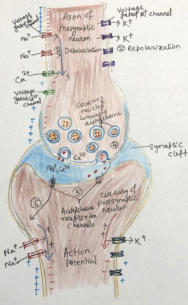 As this wave reaches the axon terminal, it activates voltage-gated calcium channels, allowing Ca²⁺ ions to enter from the extracellular fluid (step 3, figure 2). The resulting increase in intracellular calcium concentration triggers the release of acetylcholine through exocytosis into the synaptic cleft (step 4, figure 2). The neurotransmitter then diffuses across the synapse and binds to receptors on the postsynaptic cell, causing depolarization and passing the signal forward in the neural circuit.